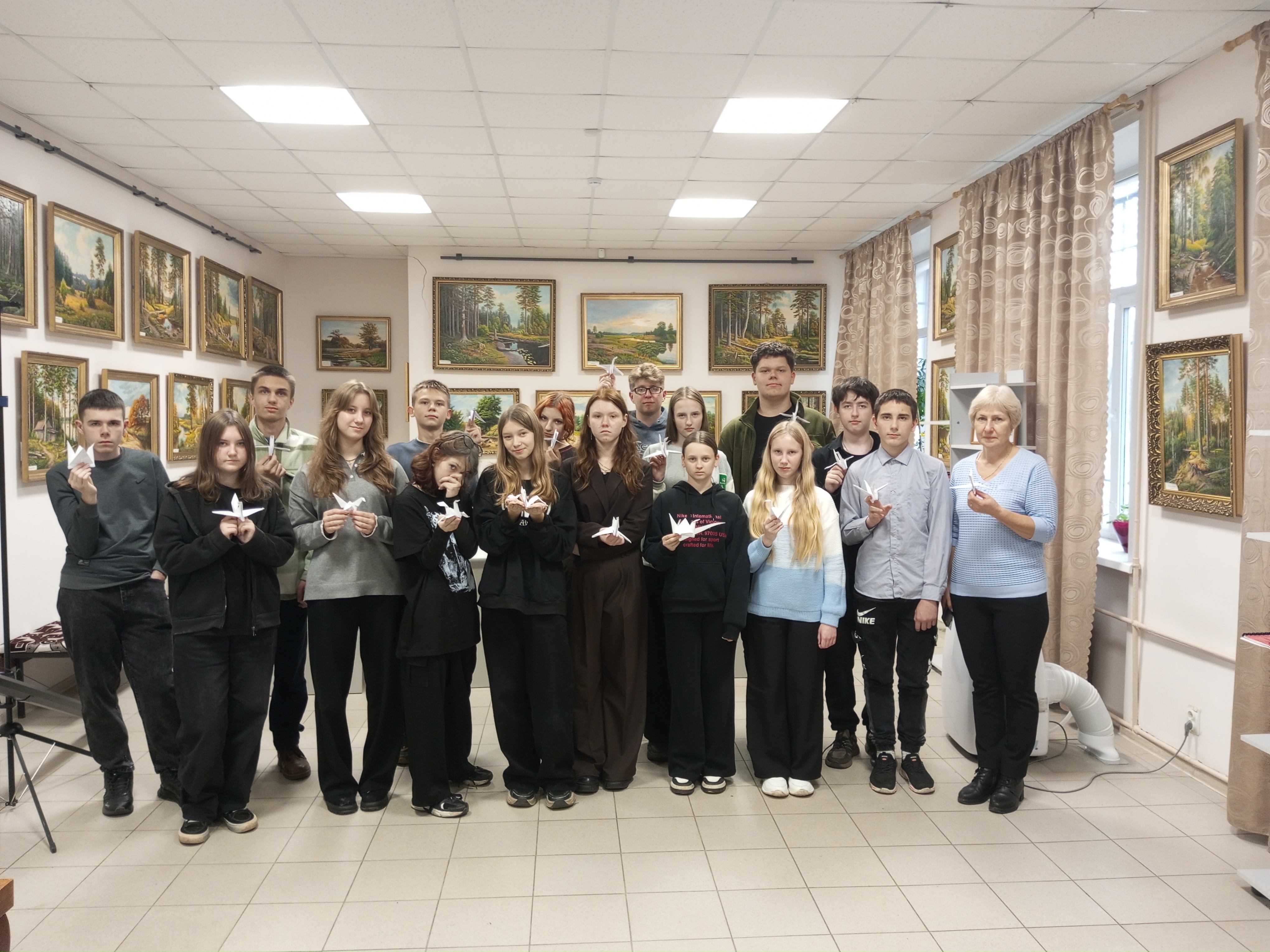 Цель проведения музейного урока - познакомить участников музейного урока с историей праздника, его символикой и традициями, с мемориальными комплексами, центральным образом которых являются летящие журавли. В конце музейного урока был проведён мастер-класс по изготовлению бумажных журавликов.