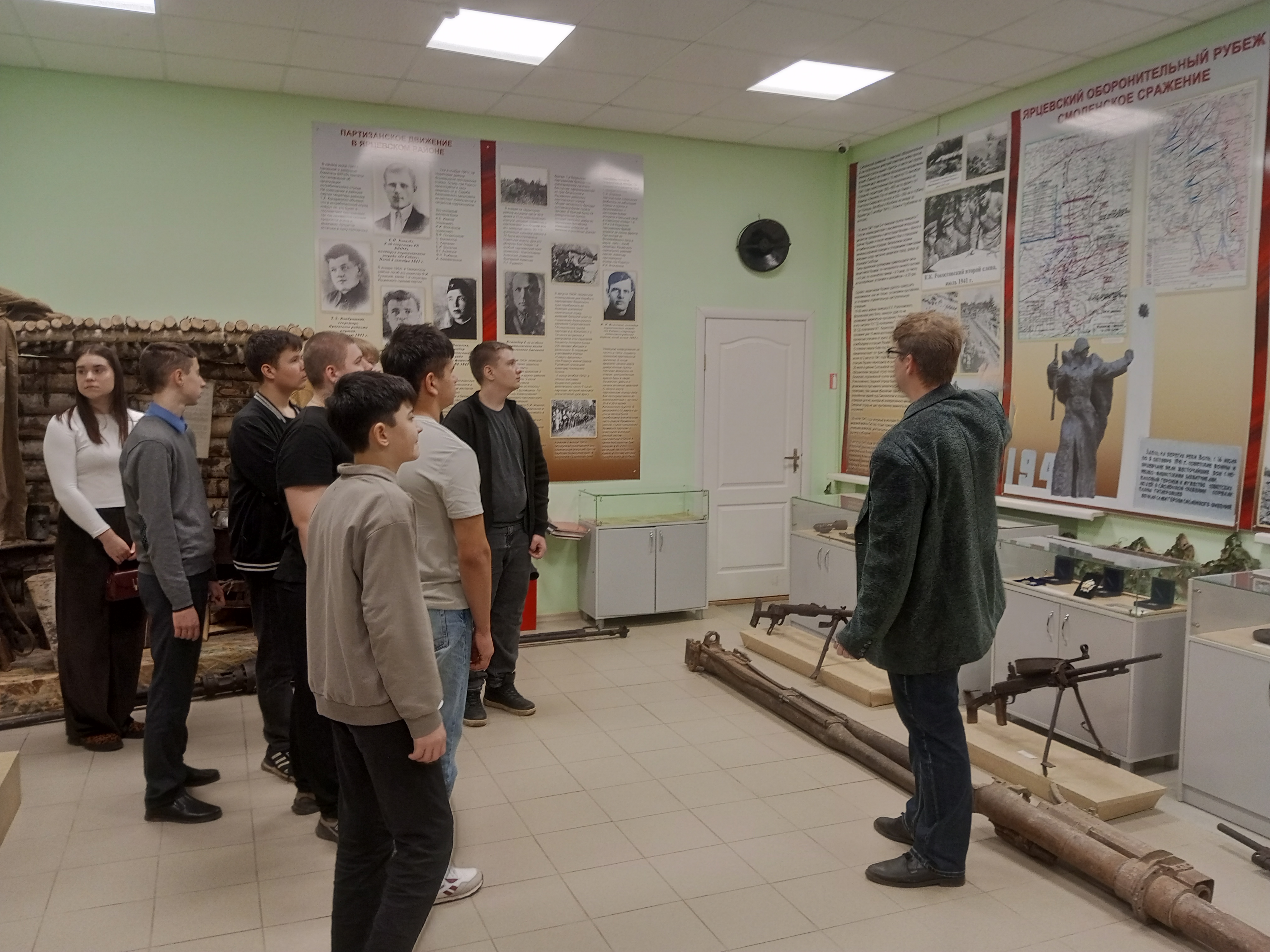 25 сентября 2025 года в МКУК «ЯИКМ» был проведён музейный урок "Операция "Суворов" для обучающихся 1 и 2 курса из СОГБПОУ "Ярцевский индустриальный техникум". В ходе проведения урока у обучающихся сформировалось представление о целях, ходе и историческом значении Смоленской наступательной операции «Суворов».
